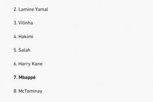 韩国记者金球投票:登贝莱亚马尔前2,姆巴佩第7,佩德里未进前10